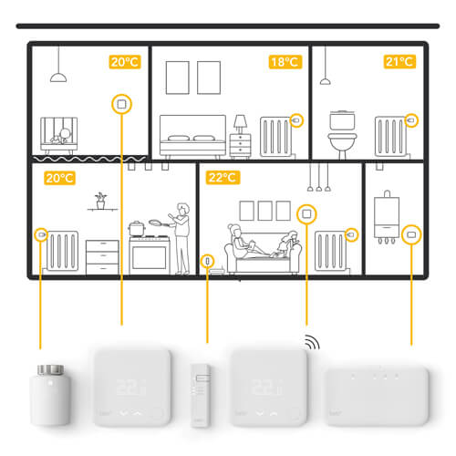 De ideale temperatuur in elke kamer apart instellen. Dat kan met dit starterspakket. Met de comfortmodus regelt de radiatorknop zelf de temperatuur. Vervang je bedrade thermostaat. Geschikt voor OpenTherm en Aan-Uit ketels.